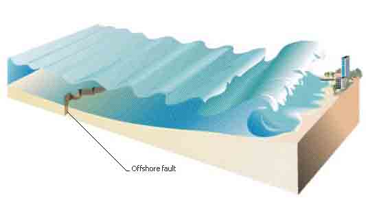A tsunami can have wavelengths, or widths, of 100 to 200 km (60 to 120 mi), and may travel hundreds of kilometers across the deep ocean, reaching speeds of about 725 to 800 km/h (about 450 to 500 mph). Upon entering shallow coastal waters, the wave, which may have been only about half a meter (a foot or two) high out at sea, suddenly grows rapidly. When the wave reaches the shore, it may be 15 m (50 ft) high or more. Tsunamis have tremendous energy because of the great volume of water affected. They are capable of obliterating coastal settlements.